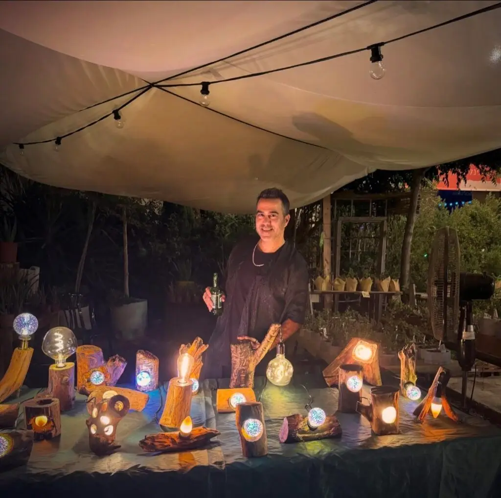 העץ נבחר, מנוקה ומשויף, ומקבל חיים חדשים דרך האור.